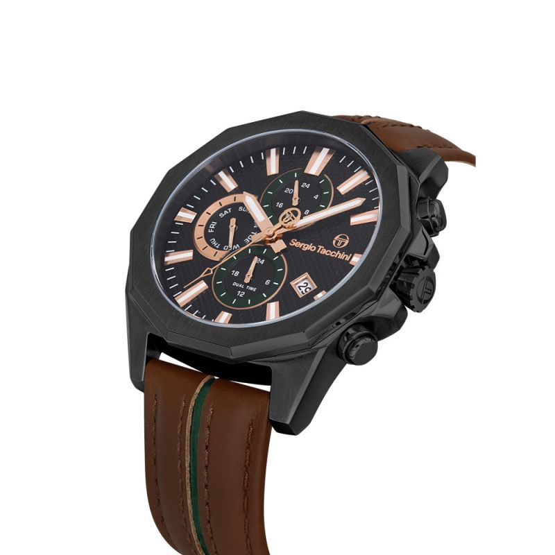Мъжки часовник Sergio Tacchini със спортно-елегантен дизайн от колекцията Archivio. Мултифункционален дисплей с показатели за дата, ден и двойно време. Луминисцентно покритие на стрелките и индексите. Минерално стъкло, устойчиво на надраскване. Стоманен корпус, съчетан с каишка от естествена кожа. Кварцов механизъм. Водоустойчивост 5 ATM - допускат се леки пръски и взимане на душ, не се препоръчва обилно мокрене.