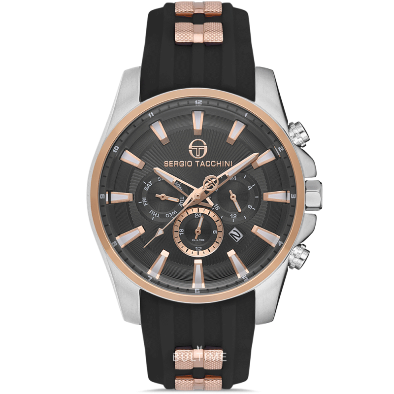 Мъжки часовник Sergio Tacchini със спортен дизайн от колекцията Archivio. Корпус от неръждаема стомана. Черна силиконова каишка с метални елементи. Мултифункционален дисплей с показатели за дата, ден и двойно време. Минерално стъкло, устойчиво на надраскване. Моделът се задвижва от кварцов механизъм. Водоустойчивост 5 ATM - допускат се леки пръски и взимане на душ, не се препоръчва обилно мокрене.
