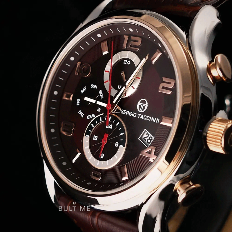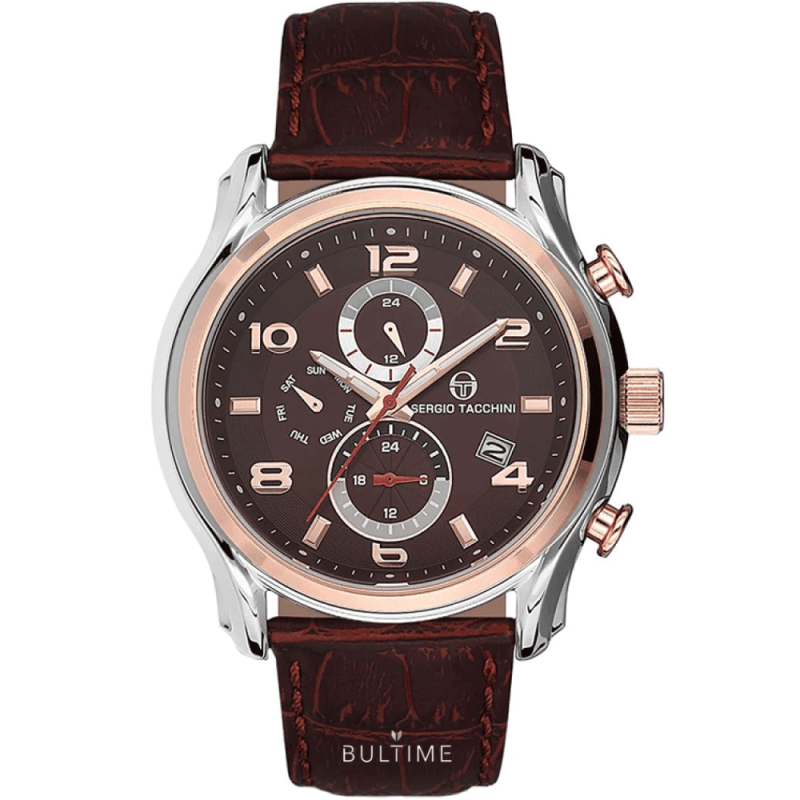 Елегантен модел мъжки часовник Sergio Tacchini. Мултифункционален дисплей с показатели за дата, ден и двойно време. Минерално стъкло, устойчиво на надраскване. Корпус от неръждаема стомана. Каишка от естествена кожа. Водоустойчивост 10 ATM - позволява мокрене, къпане и плуване във водни басейни.