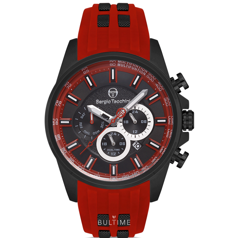 Спортен модел мъжки часовник Sergio Tacchini с модерна визия от колекцията Heritech. Корпус от неръждаема стомана. Червена силиконова каишка с метални релефни елементи. Черен мултифункционален дисплей с показатели за дата, ден и двойно време. Минерално стъкло, устойчиво на надраскване. Кварцов механизъм. Водоустойчивост 5 ATM - допускат се леки пръски и взимане на душ, не се препоръчва обилно мокрене.