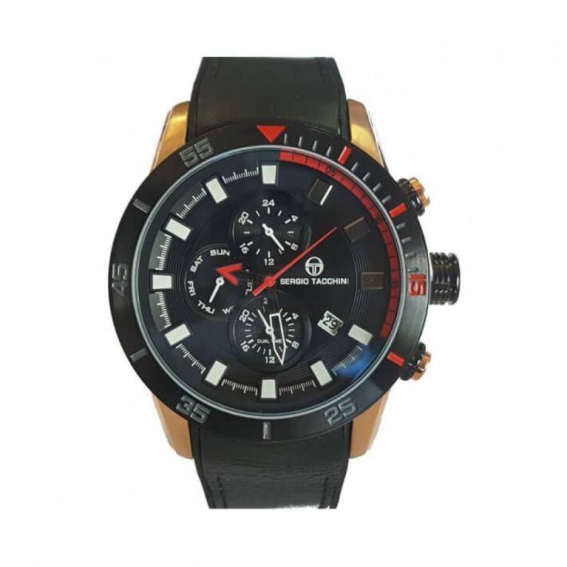 Мъжки часовник Sergio Tacchini със спортно-елегантен дизайн. Корпус от неръждаема стомана, съчетан с черна кожена каишка. Мултифункционален дисплей с показатели за дата, ден и двойно време. Стъкло минерал-кристал. Задвижва се от кварцов механизъм. Водоустойчивост 10 ATM - позволява мокрене, къпане и плуване във водни басейни.