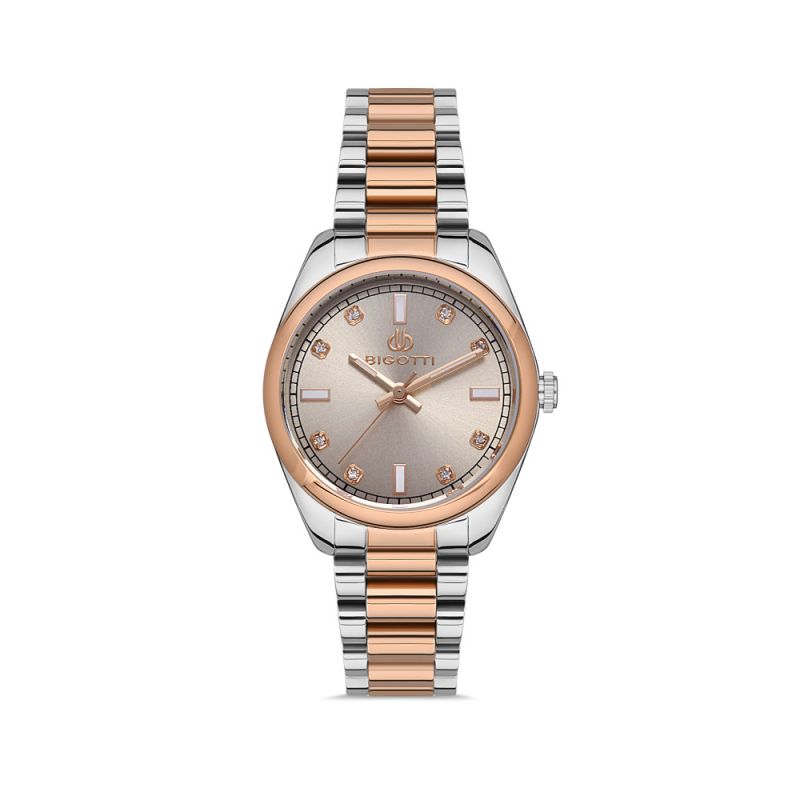 Елегантен дамски часовник Bigotti с нежна визия от колекцията Roma. Аналогов дисплей с изчистен дизайн и декорация от инкрустирани кристали. Луминисцентно покритие на стрелките и индексите. Минерално стъкло, устойчиво на надраскване. Моделът е с метален корпус и верижка от неръждаема стомана. Задвижва се от кварцов механизъм. Водоустойчивост 3 ATM - допускат се леки пръски, не се препоръчва обилно мокрене.