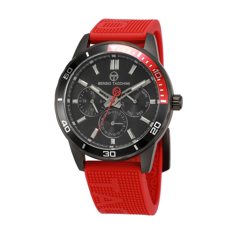 Спортен модел мъжки часовник Sergio Tacchini от колекцията Archivio. Корпус от неръждаема стомана. Черен мултифункционален дисплей, съчетан с червена силиконова каишка. Стъкло минерал-кристал. Задвижва се от кварцов механизъм. Водоустойчивост 5 ATM - допускат се леки пръски и взимане на душ, не се препоръчва обилно мокрене.