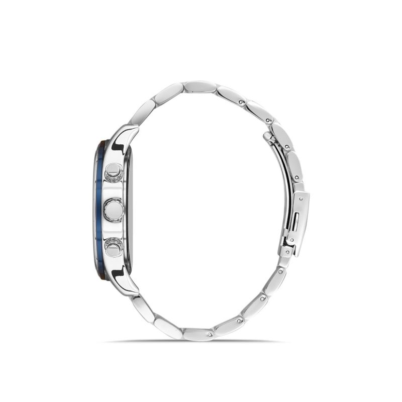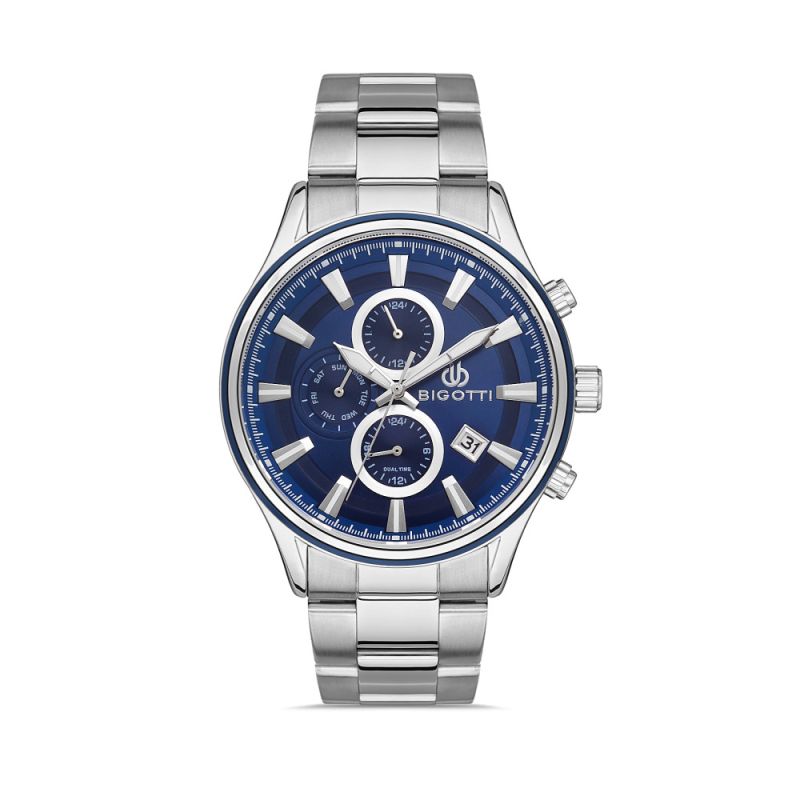 Мъжки часовник Bigotti с модерна елегантна визия от колекцията Milano. Син мултифункционален дисплей със сребристи детайли. Луминисцентно покритие на стрелките и индексите. Минерално стъкло, устойчиво на надраскване. Метален корпус съчетан с верижка от неръждаема стомана. Задвижва се от кварцов механизъм. Водоустойчивост 5 ATM - допускат се леки пръски и взимане на душ, не се препоръчва обилно мокрене.