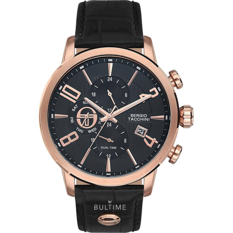 Спортно-елегантен мъжки часовник Sergio Tacchini от колекцията City Dual Time. Мултифункционален дисплей с фосфоресциращи стрелки и показатели за дата, ден и двойно време. Минерално стъкло, устойчиво на надраскване. Корпус от неръждаема стомана. Черна кожена каишка. Кварцов механизъм. Водоустойчивост 5 ATM - допускат се леки пръски и взимане на душ, не се препоръчва обилно мокрене.