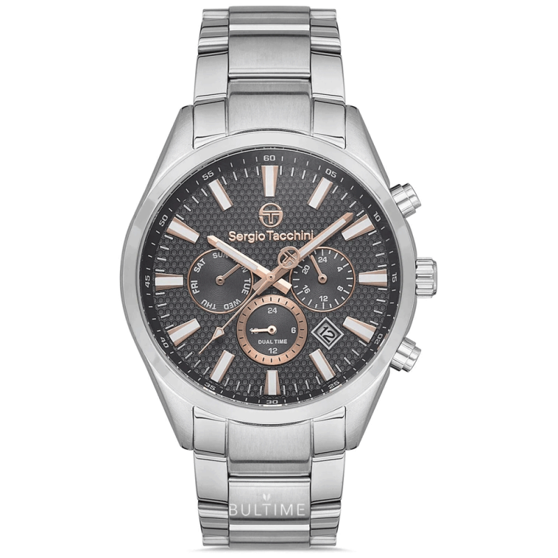 Мъжки часовник Sergio Tacchini от колекцията Archivio. Моделът е с корпус и верижка от неръждаема стомана. Тъмносив мултифункционален дисплей с показатели за дата, ден и двойно време . Минерално стъкло, устойчиво на надраскване. Кварцов механизъм. Водоустойчивост 5 ATM - допускат се леки пръски и взимане на душ, не се препоръчва обилно мокрене.