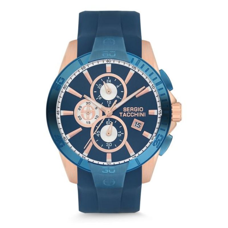 Мъжки часовник Sergio Tacchini със спортно-елегантен дизайн от колекцията Archivio Chronograph. Дисплей хронограф с точност 1/60 от минутата и максимално измервано време 30 минути. Фосфоресциращи стрелки и индекси. Минерално стъкло, устойчиво на надраскване с антирефлексно покритие. Корпус от неръждаема стомана. Синя каишка от висококачествен силикон. Прецизен кварцов механизъм JS15 CITIZEN MIYOTA произведен в Япония. Водоустойчивост 10 ATM - позволява мокрене, къпане и плуване във водни басейни.