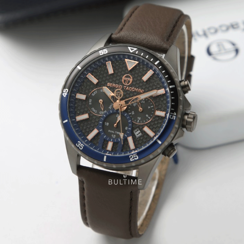 Спортно-елегантен мъжки часовник Sergio Tacchini от колекцията Archivio. Моделът е с тъмносив мултифункционален дисплей с показатели за дата, ден и двойно време. Корпус от неръждаема стомана, съчетан с каишка от естествена кожа. Минерално стъкло, устойчиво на надраскване. Задвижва се от кварцов механизъм. Водоустойчивост 5 ATM - допускат се леки пръски и взимане на душ, не се препоръчва обилно мокрене.
