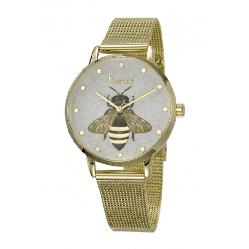 Дамски часовник Freelook от колекцията Eiffel. Моделът е с корпус и верижка ситна плетка от неръждаема стомана. Стъкло минерал-кристал. Аналогов дисплей с декорация във формата на пчела. Кварцов механизъм. Водоустойчивост 3 ATM - допускат се леки пръски, не се препоръчва обилно мокрене.