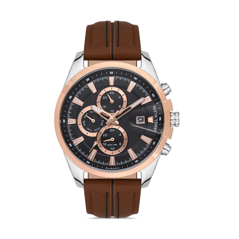 Спортно-елегантен мъжки часовник Daniel Klein с модерна визия от колекцията Exclusive. Моделът е с метален корпус съчетан с каишка от естесвена кожа. Мултифункционален дисплей с показатели за дата, ден от седмицата и двойно време. Луминисцентно покритие на стрелките и индексите. Минерално стъкло, устойчиво на надраскване. Часовникът се задвижва от кварцов механизъм. Водоустойчивост 5 ATM - допускат се леки пръски и взимане на душ, не се препоръчва обилно мокрене.
