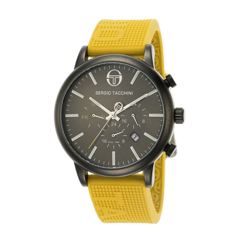 Спортен модел мъжки часовник Sergio Tacchini от колекцията Streamline. Корпус от неръждаема стомана. Черен мултифункционален дисплей, съчетан със жълта силиконова каишка с голямо лого. Стъкло минерал-кристал. Задвижва се от кварцов механизъм. Водоустойчивост 5 ATM - допускат се леки пръски и взимане на душ, не се препоръчва обилно мокрене.