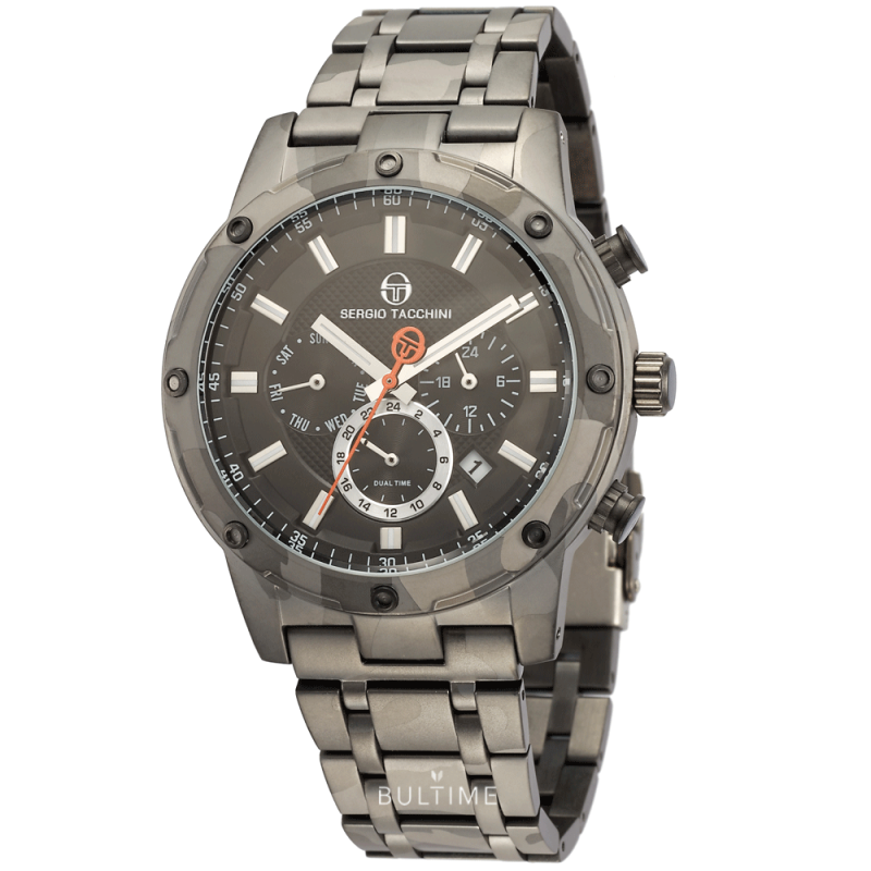 Мъжки часовник Sergio Tacchini от колекцията Archivio. Корпус и верижка с камуфлажна шарка от неръждема стомана . Сив мултифункционален дисплей с показатели за дата, ден и двойно време. Стъкло минерал-кристал. Задвижва се от кварцов механизъм. Водоустойчивост 5 ATM - допускат се леки пръски и взимане на душ, не се препоръчва обилно мокрене.