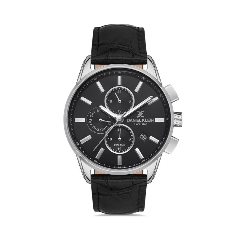 Спортно-елегантен мъжки часовник Daniel Klein от колекцията Exclusive. Моделът е с метален корпус и каишка от естствена кожа. Мултифункционален дисплей с показатели за дата, ден и двойно време. Минерално стъкло, устойчиво на надраскване. Задвижва се от кварцов механизъм. Водоустойчивост 5 ATM - допускат се леки пръски и взимане на душ, не се препоръчва обилно мокрене.