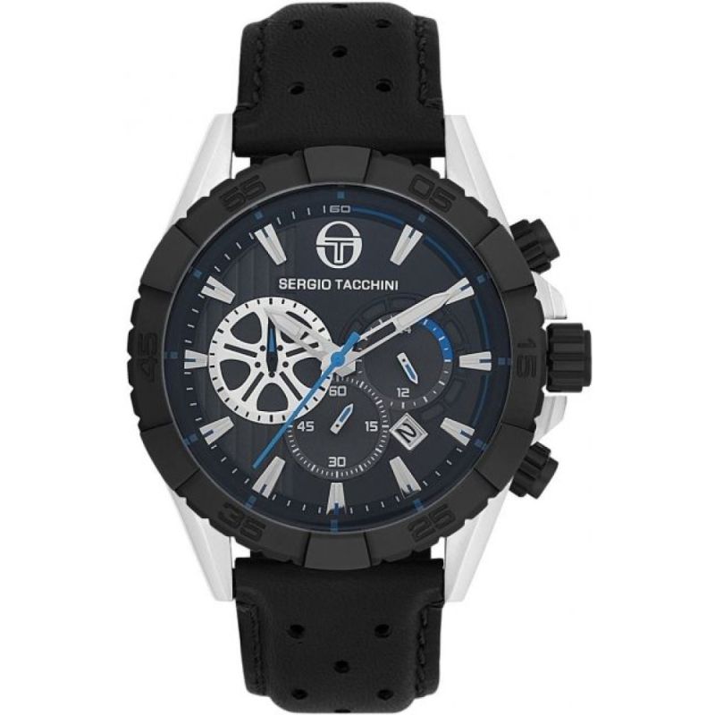 Спортно-елегантен мъжки часовник Sergio Tacchini от колекцията Archivio Chronograph. Черен дисплей хронограф с точност 1/60 от минутата и максимално измервано време 30 минути. Фосфоресциращи стрелки и индекси. Минерално стъкло, устойчиво на надраскване с антирефлексно покритие. Корпусът е изработен от неръждаема стомана и е съчетан с каишка от естествена кожа. Прецизен кварцов механизъм JS15 CITIZEN MIYOTA произведен в Япония. Водоустойчивост 10 ATM - позволява мокрене, къпане и плуване във водни басейни.