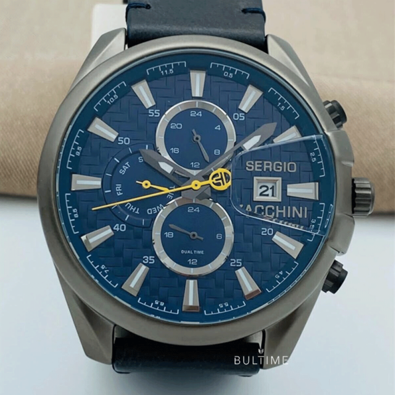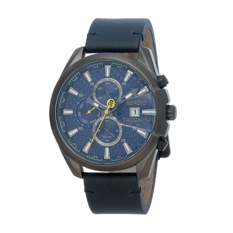 Мъжки спортно-елегантен часовник Sergio Tacchini от колекцията Archivio. Моделът е с тъмносин мултифункционален дисплей с показатели за дата, ден и двойно време. Каишка от естествена кожа. Корпус от неръждаема стомана. Стъкло минерал-кристал. Кварцов механизъм. Водоустойчивост 5 ATM - допускат се леки пръски и взимане на душ, не се препоръчва обилно мокрене.