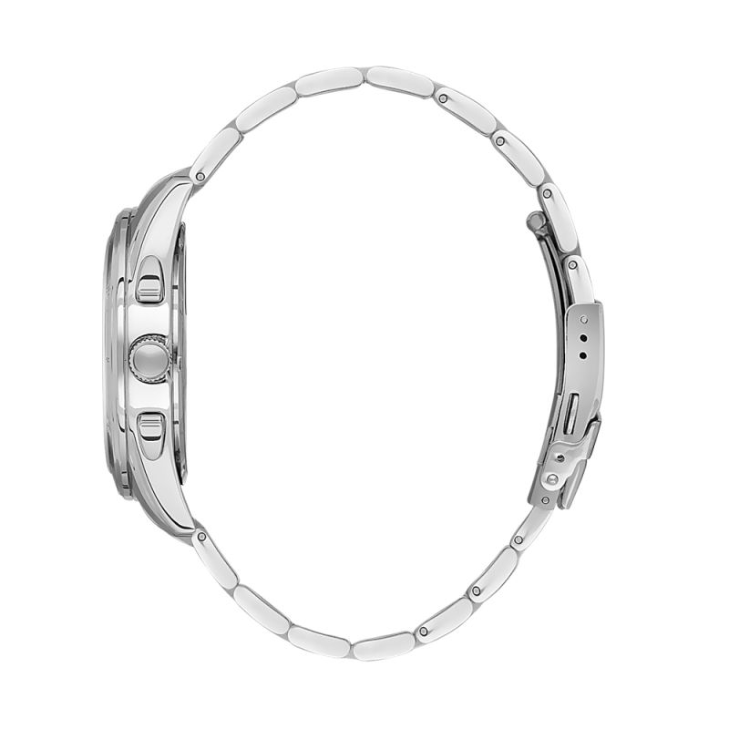Спортно-елегантен мъжки часовник с мултифункционален дисплей. Метален корпус съчетан с верижка от неръждаема стомана. Стъкло минерал-кристал. Часовникът се задвижва от кварцов механизъм. Водоустойчивост 5 ATM - допускат се леки пръски и взимане на душ, не се препоръчва обилно мокрене.