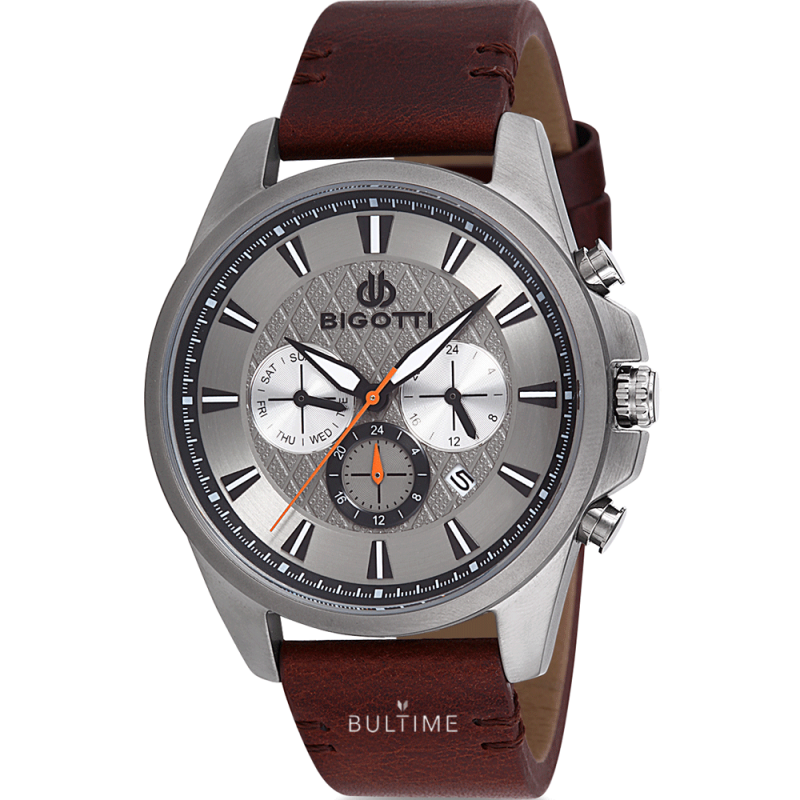 Мъжки часовник Bigotti с корпус от неръждаема стомана в тъмносив цвят. Кафява каишка от естествена кожа. Моделът е с минерално стъкло и