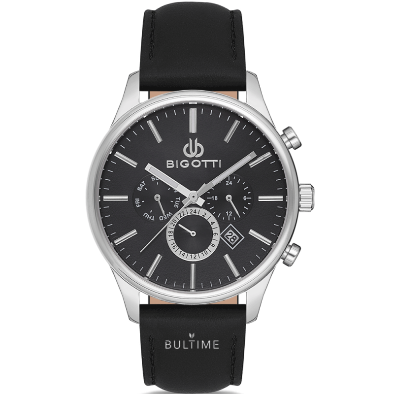 Мъжки часовник Bigotti с метален корпус. Черна каишка от естествена кожа. Мултифункционален дисплей с показател за ден и дата. Стилен черен циферблат със сребристи стрелки. Стъкло минерал-кристал. Кварцов механизъм.