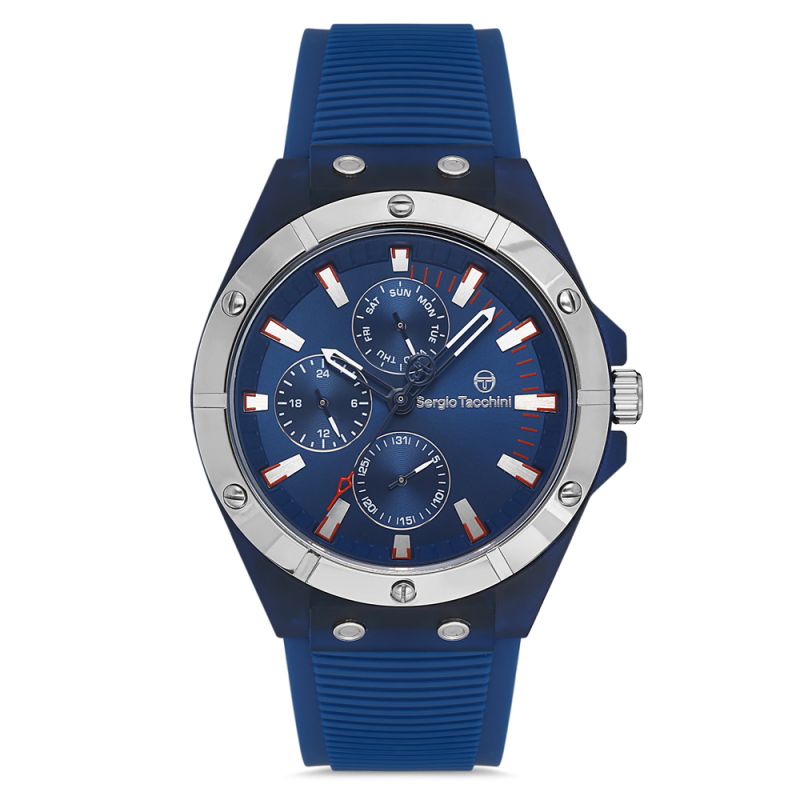 Мъжки часовник Sergio Tacchini от колекцията Streamline с мултифункционален дисплей. Корпус от полимер. Синя силиконова каишка. Кварцов механизъм. Водоустойчивост 5 ATM - допускат се леки пръски и взимане на душ, не се препоръчва обилно мокрене.